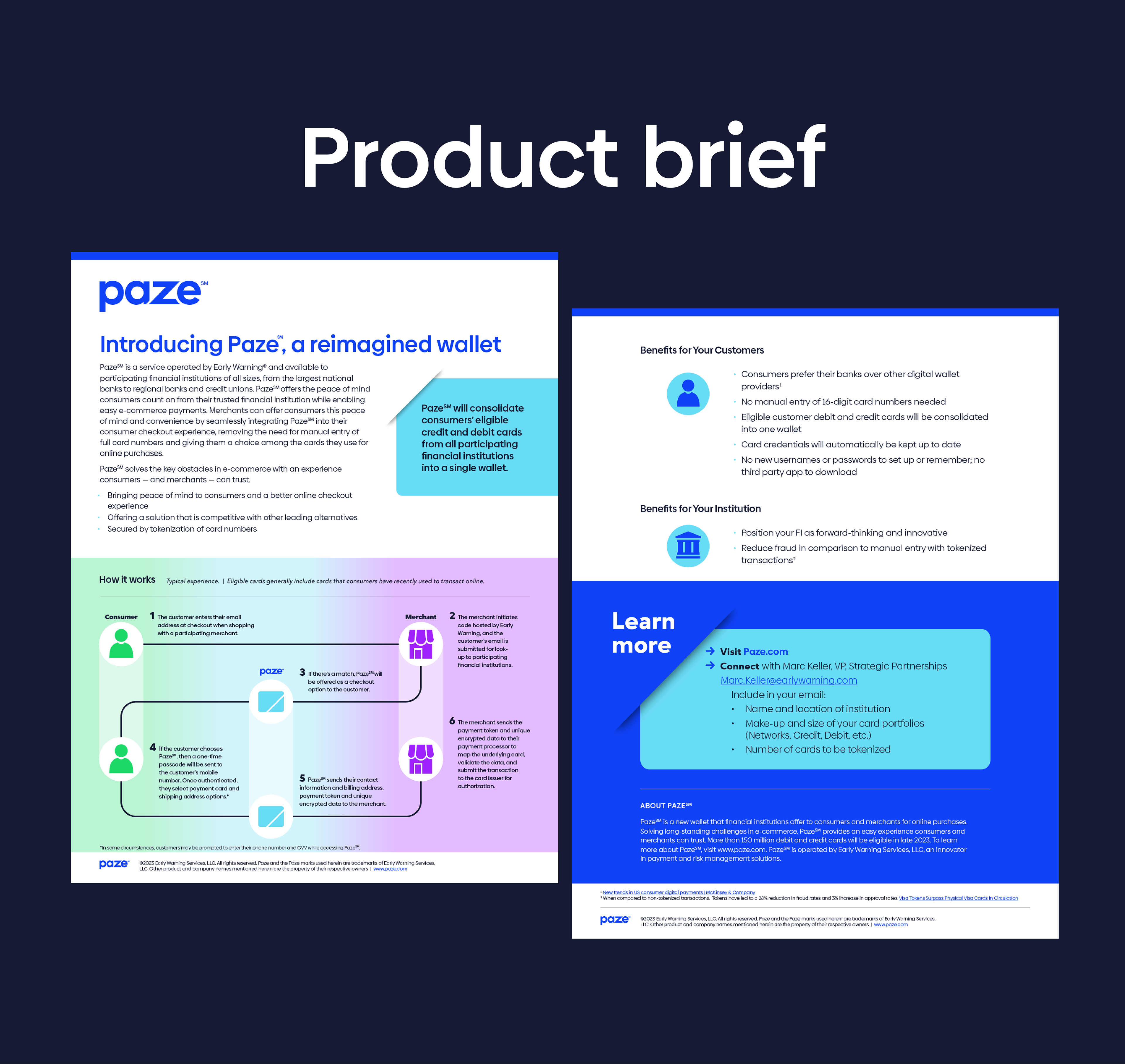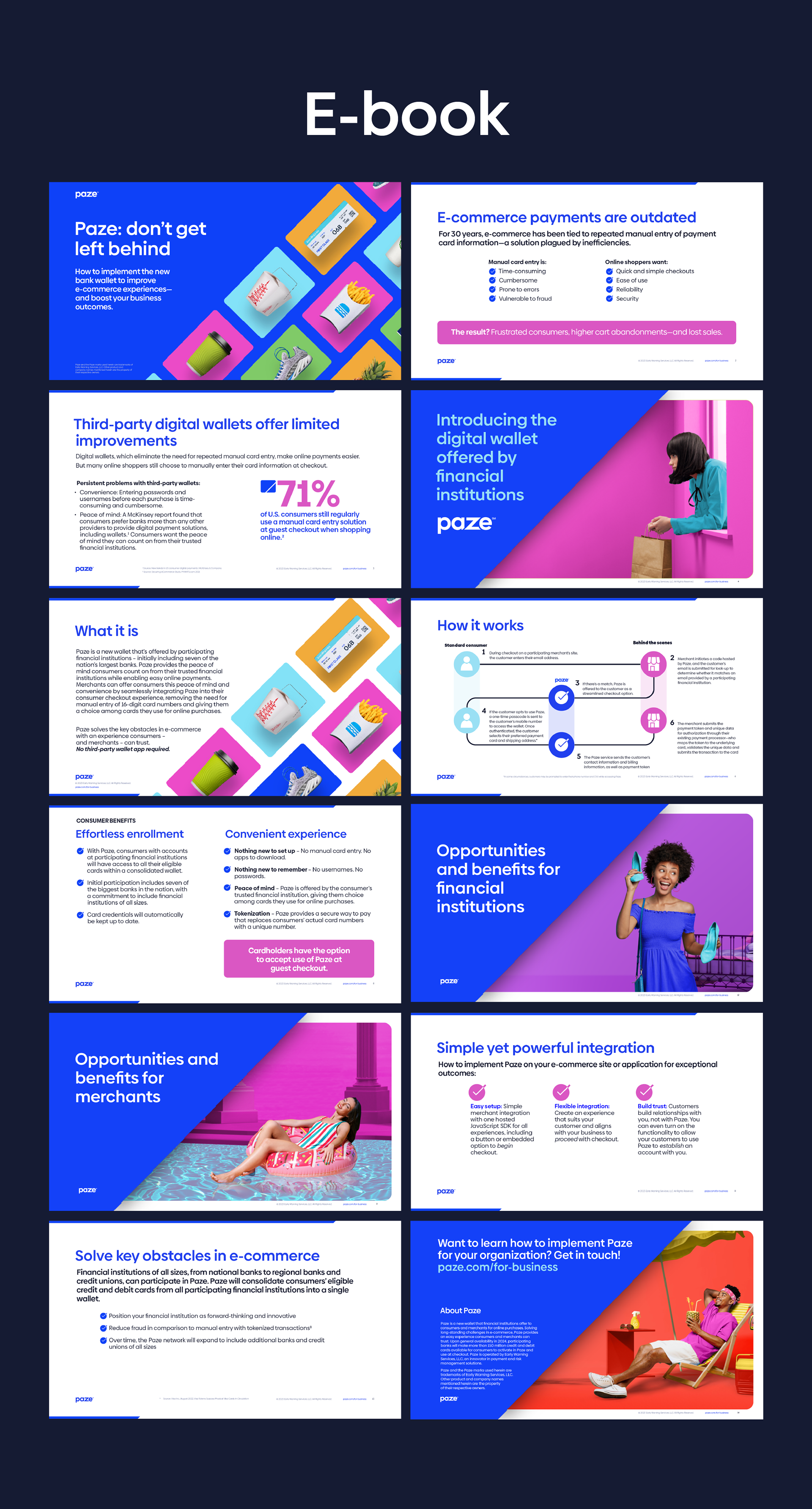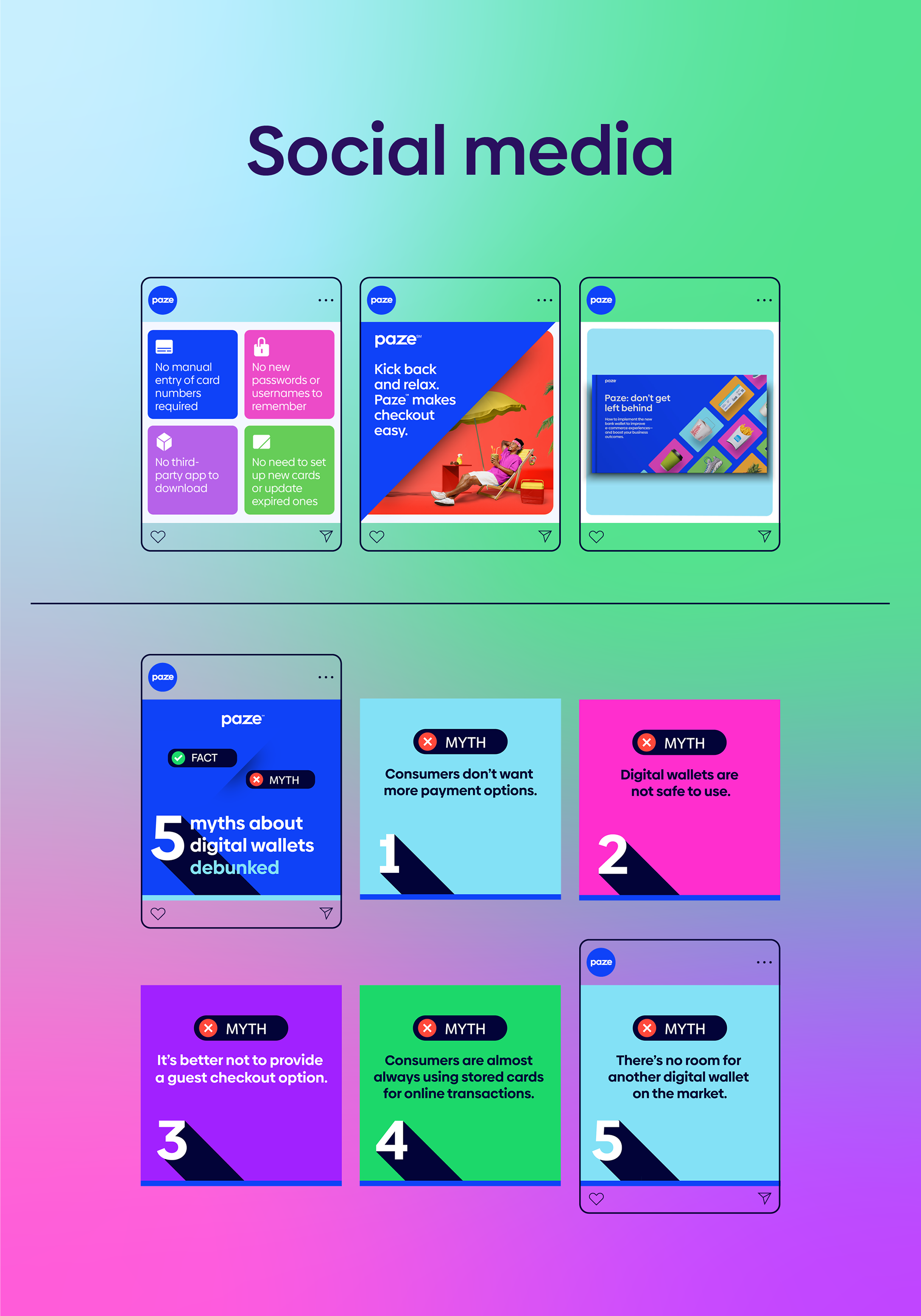 Below are samples from a set of launch materials for Paze, a new digital wallet offered within consumer checkout experiences in the U.S. My goal was to establish a strong, consistent look and feel to achieve brand awareness using the brand's bold typography and vibrant color palette.